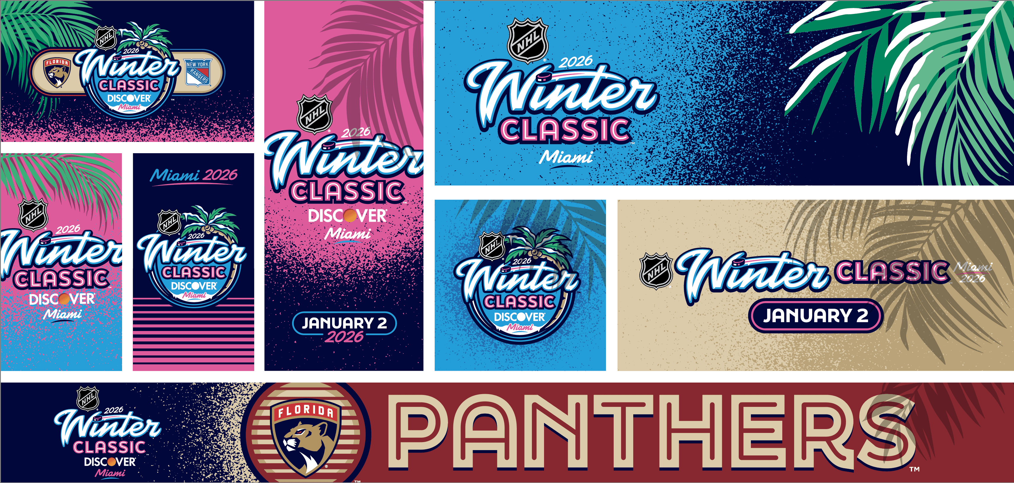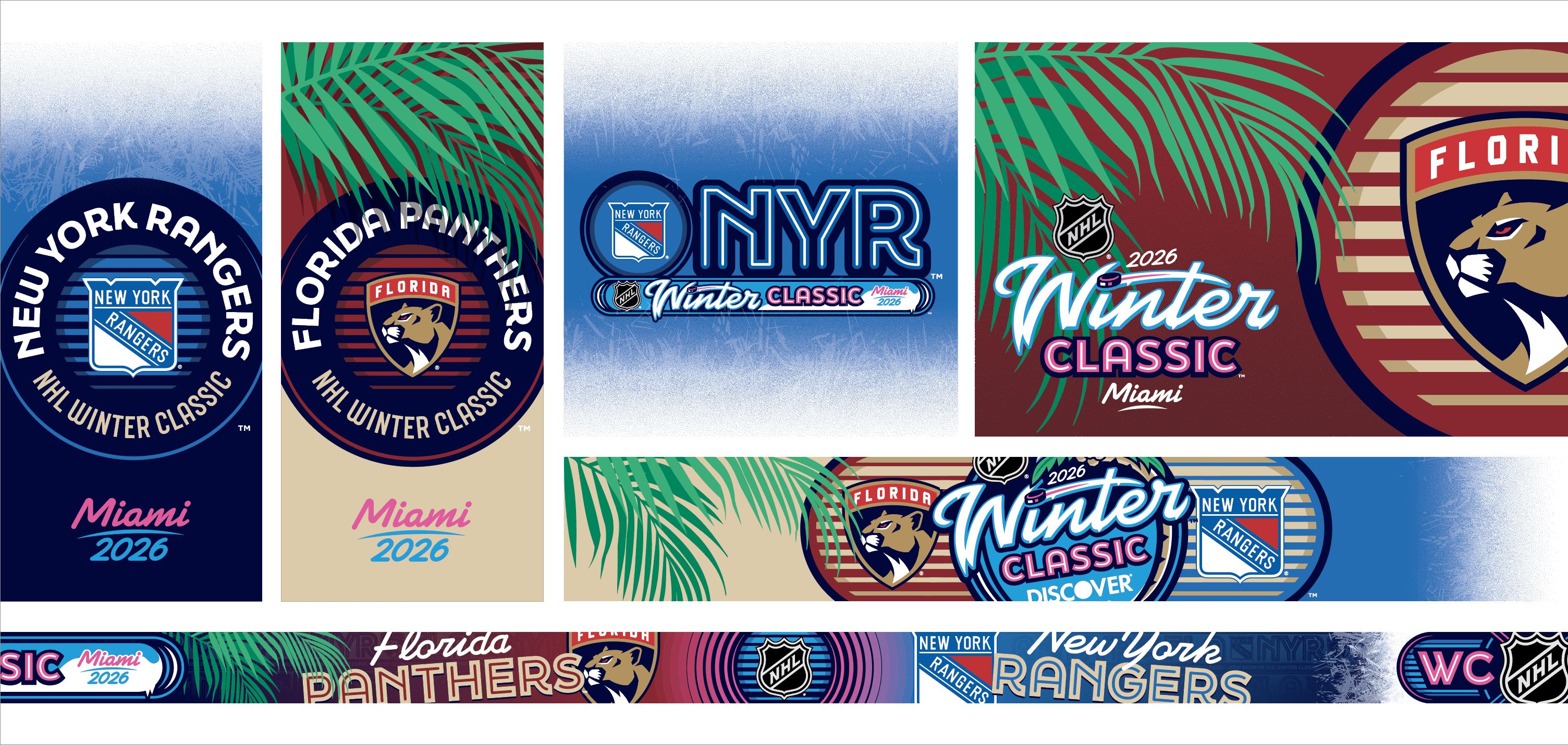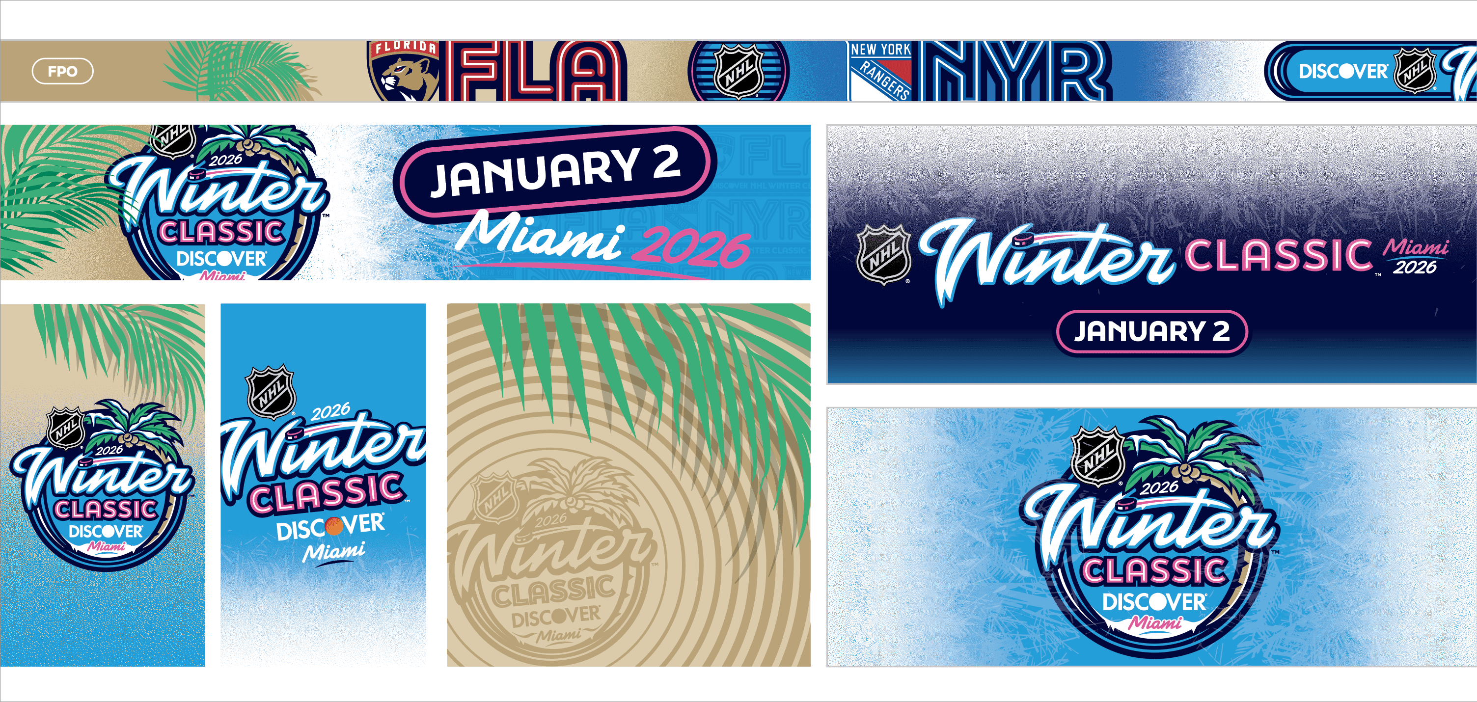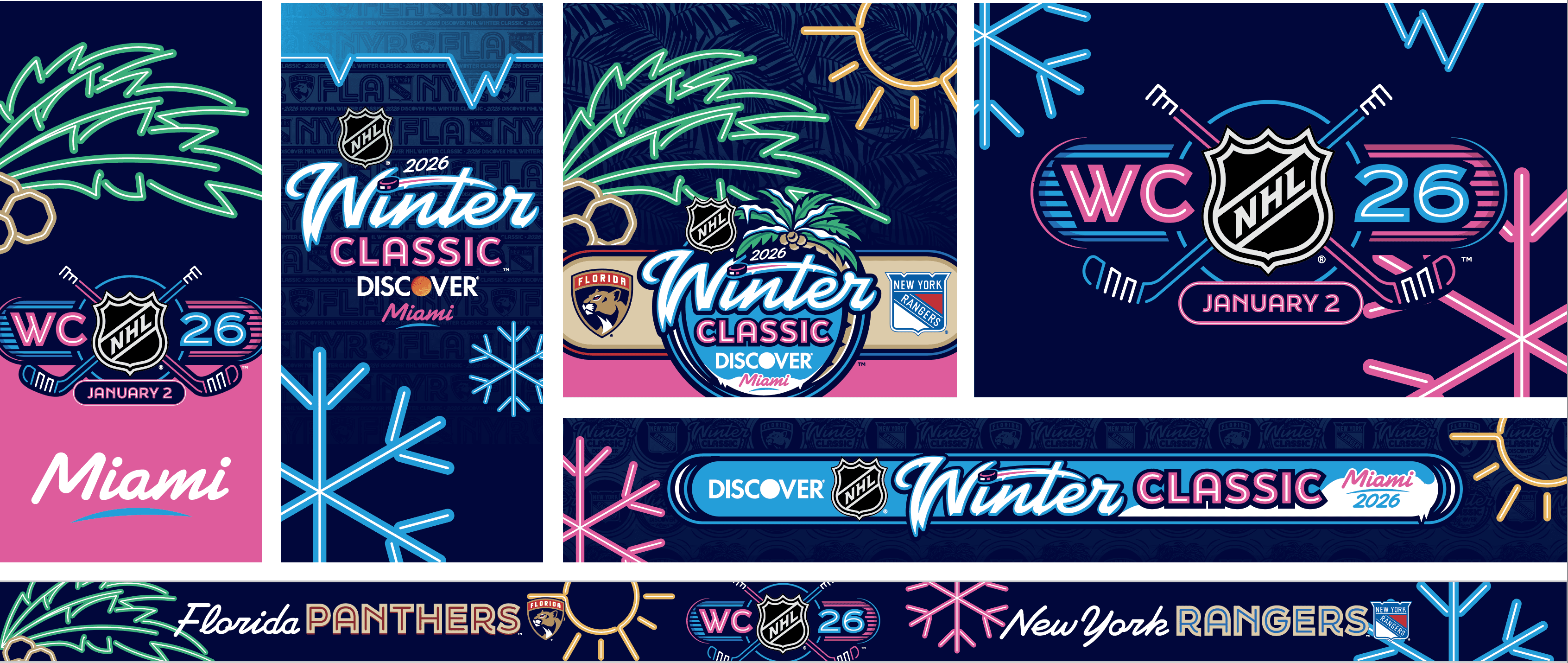 The 2026 NHL Winter Classic was set in Miami with a goal of making the impossible possible. Outdoor hockey in south Florida was an ambitious goal, and my team and I at Elevate were tasked with designing a graphical system that fits the bill. Our work included everything from graphics at NHL hotels, the NHL's New Years Eve Bash, the PreGame event, stadium exterior, stadium suites, concourse, retail locations, and the field itself surrounding the rink.