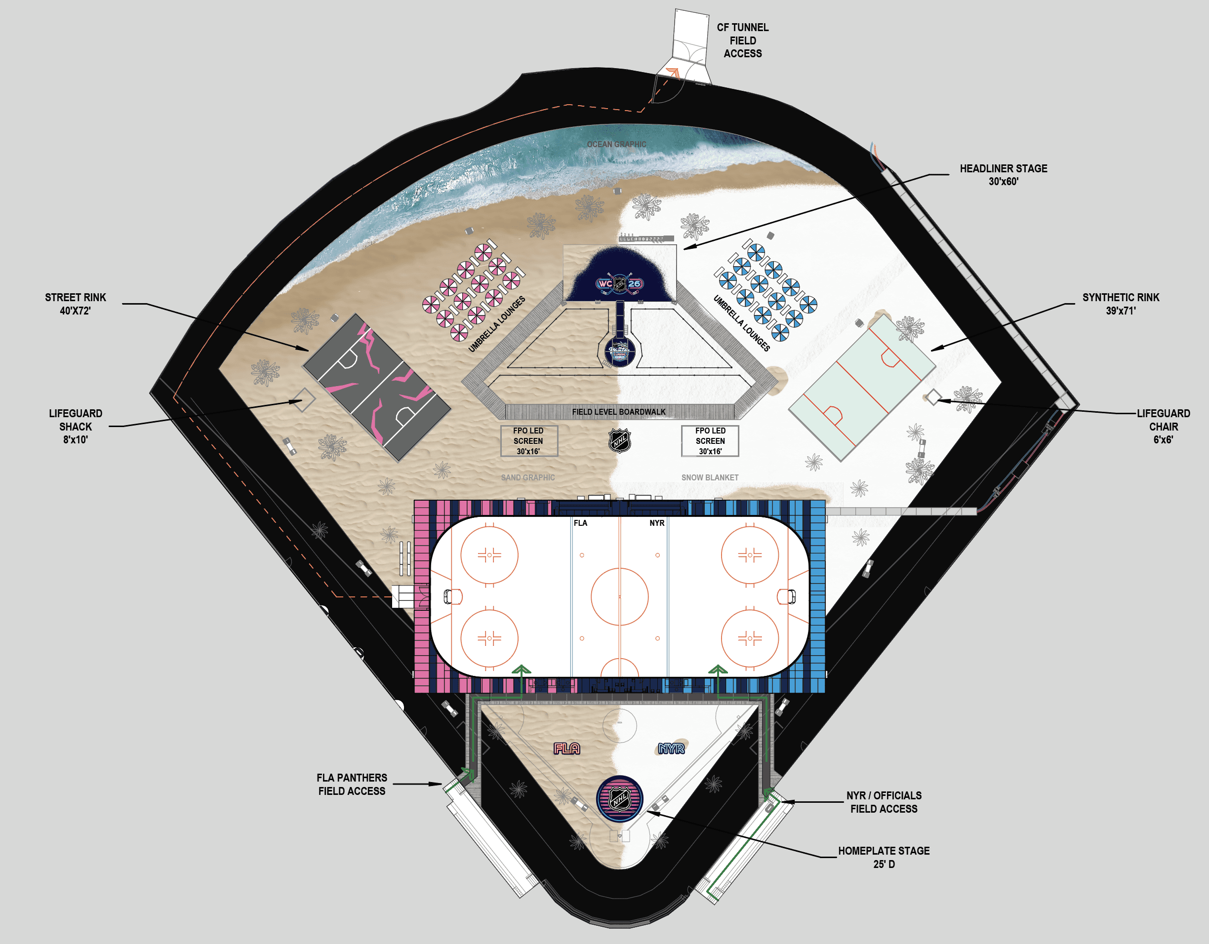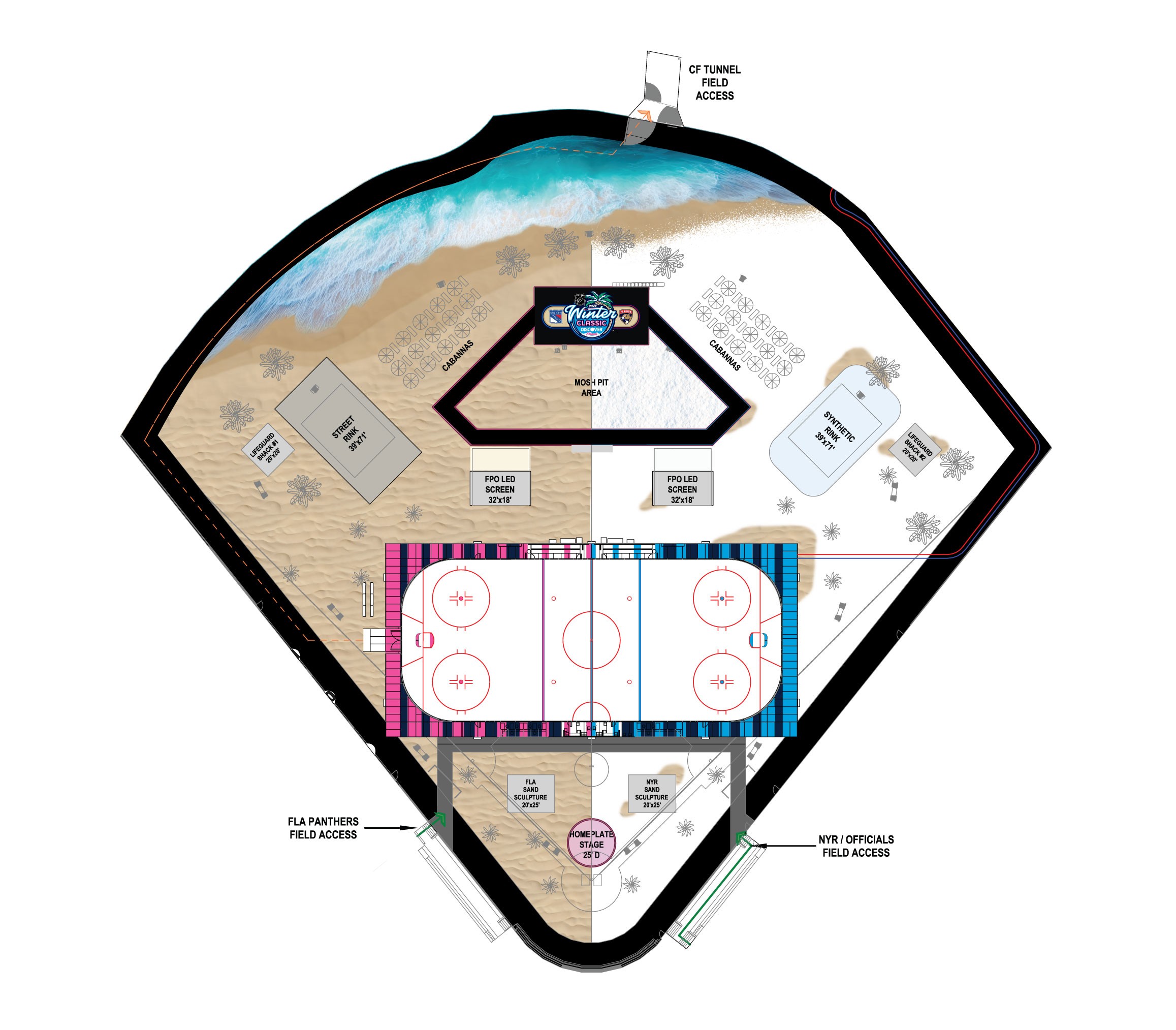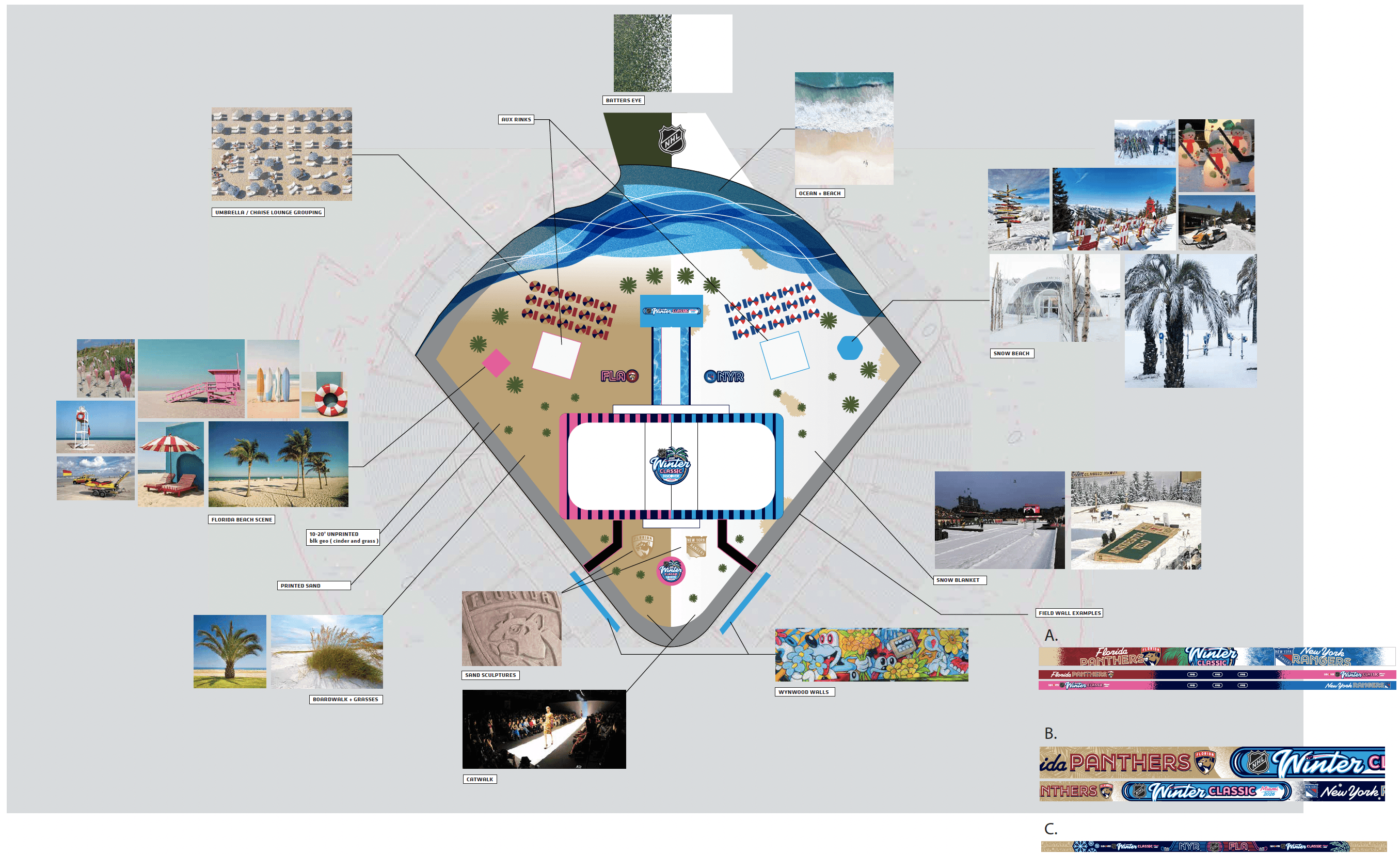 My team was also tasked with the design of all graphics and fabricated items to be applied on the field. My responsibility in this was creating the beach and "snow beach" split to be printed on mesh and applied to the field. This scope was juggled with designing for the rest of the printed materials around Miami, requiring efficient processes to meet deadlines.