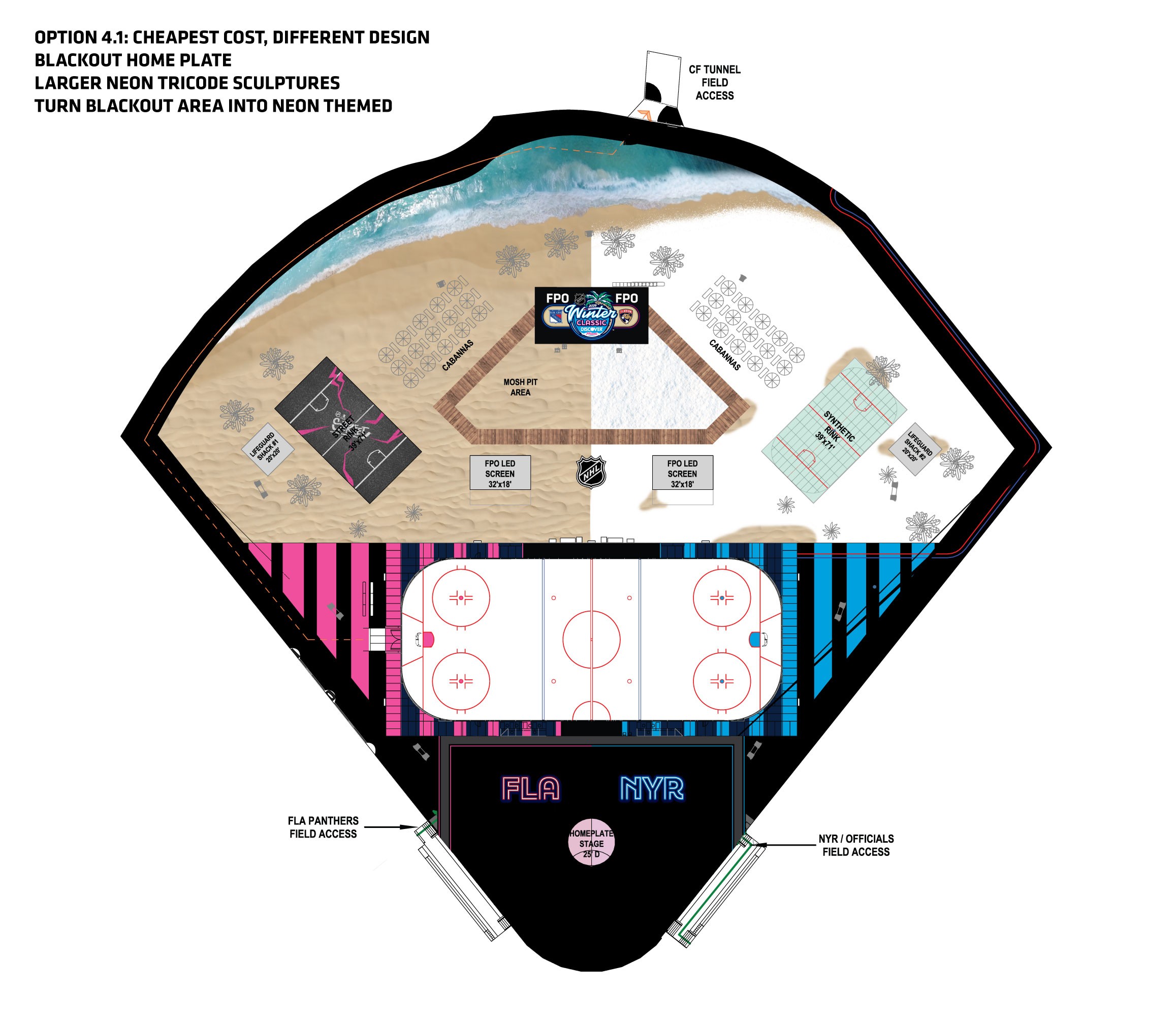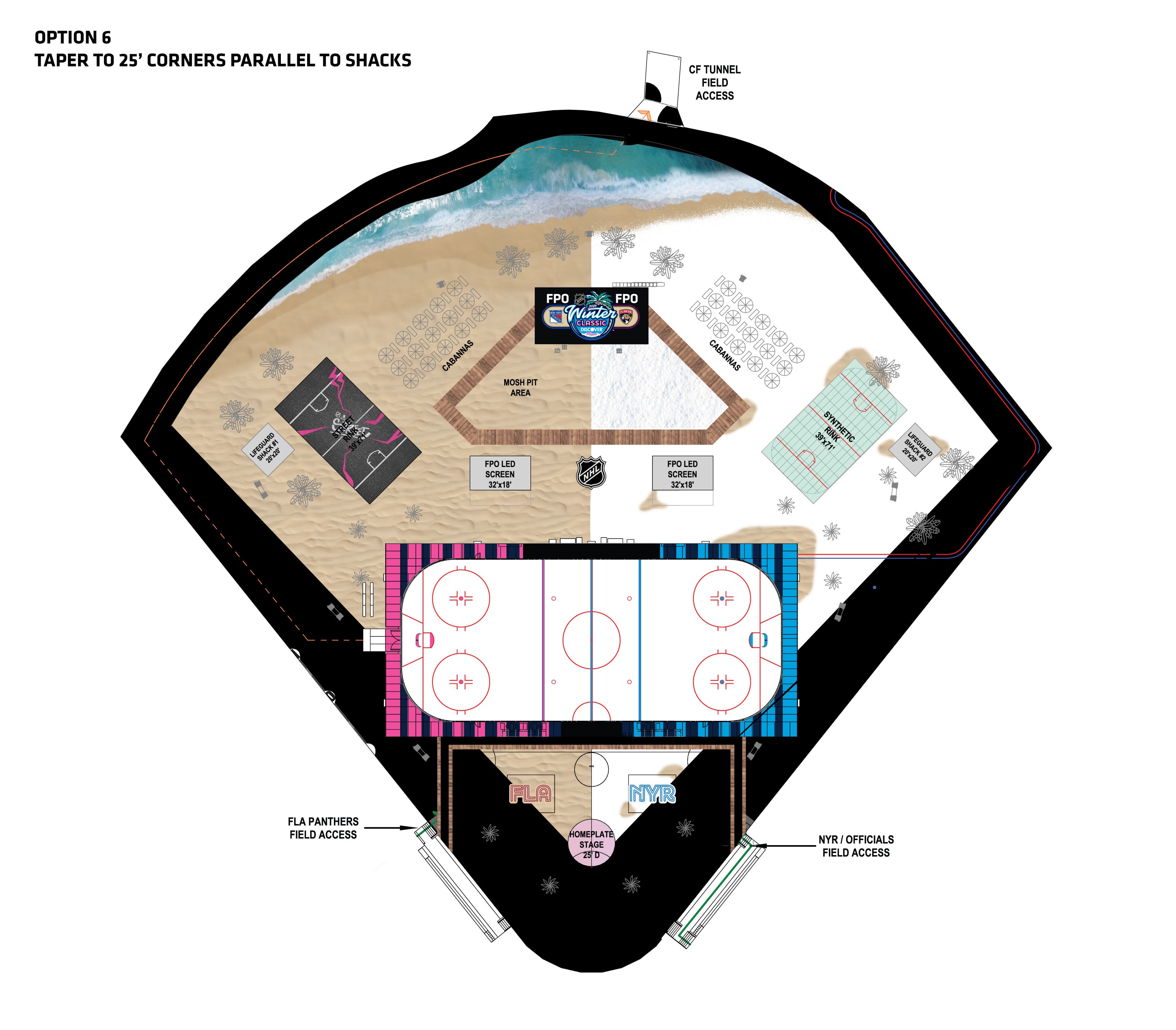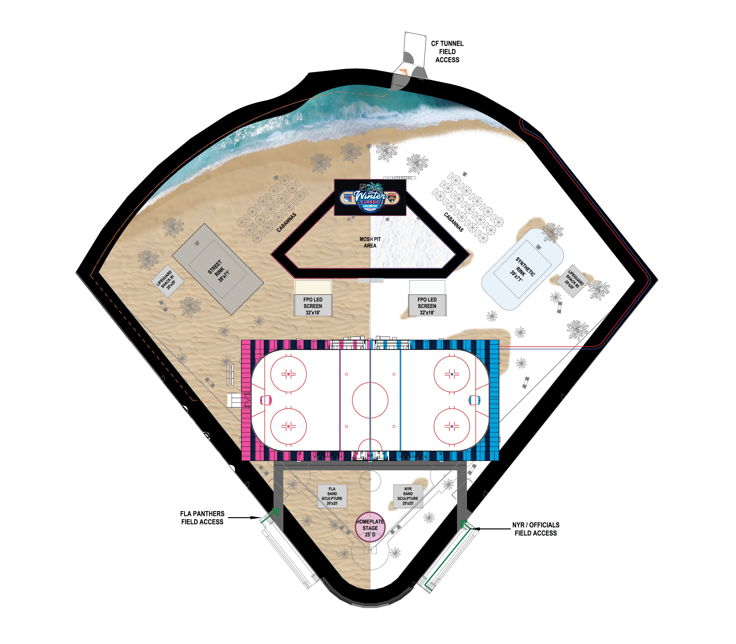 My team was also tasked with the design of all graphics and fabricated items to be applied on the field. My responsibility in this was creating the beach and "snow beach" split to be printed on mesh and applied to the field. This scope was juggled with designing for the rest of the printed materials around Miami, requiring efficient processes to meet deadlines.